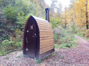 Der Weg führte uns zunächst bergauf durch den Wald. Ich bereute schon, meinen Pulli in Allmo gelassen zu haben. Doch wir waren ausreichend in Bewegung, dass wir nicht frieren mussten. An einer T-Kreuzung mussten wir uns entscheiden. Zur Galerie führte linksherum der kürzere Weg, und rechtsherum ein längerer Weg. Was unter kurz und lang zu verstehen war, dazu fehlten auf dem Schild die Informationen.