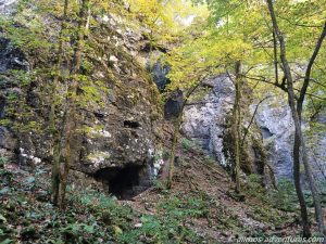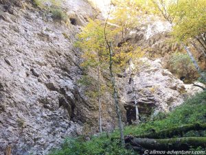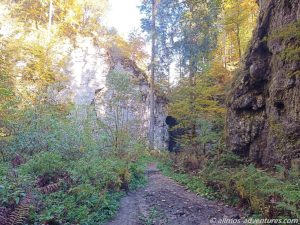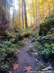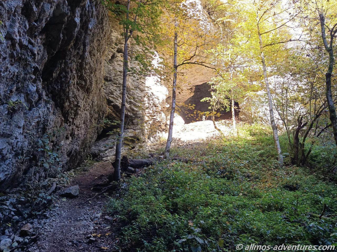 Endlich schaffte es auch die Sonne uns zu erreichen und die Blätter der Bäume glänzten goldgelb. Nachdem wir zunächst ein Stück ohne merkliche Steigung wanderten, ging es erneut bergauf, um im weiteren Verlauf des Weges wieder bergrunter zu gehen. Der Abstieg hatte es ganz schön in sich. Durch eine natürliche Höhle gelangten wir schließlich wieder an die T-Kreuzung, an der wir vorhin links abgebogen waren.