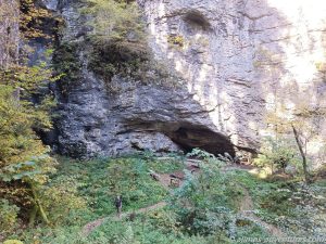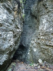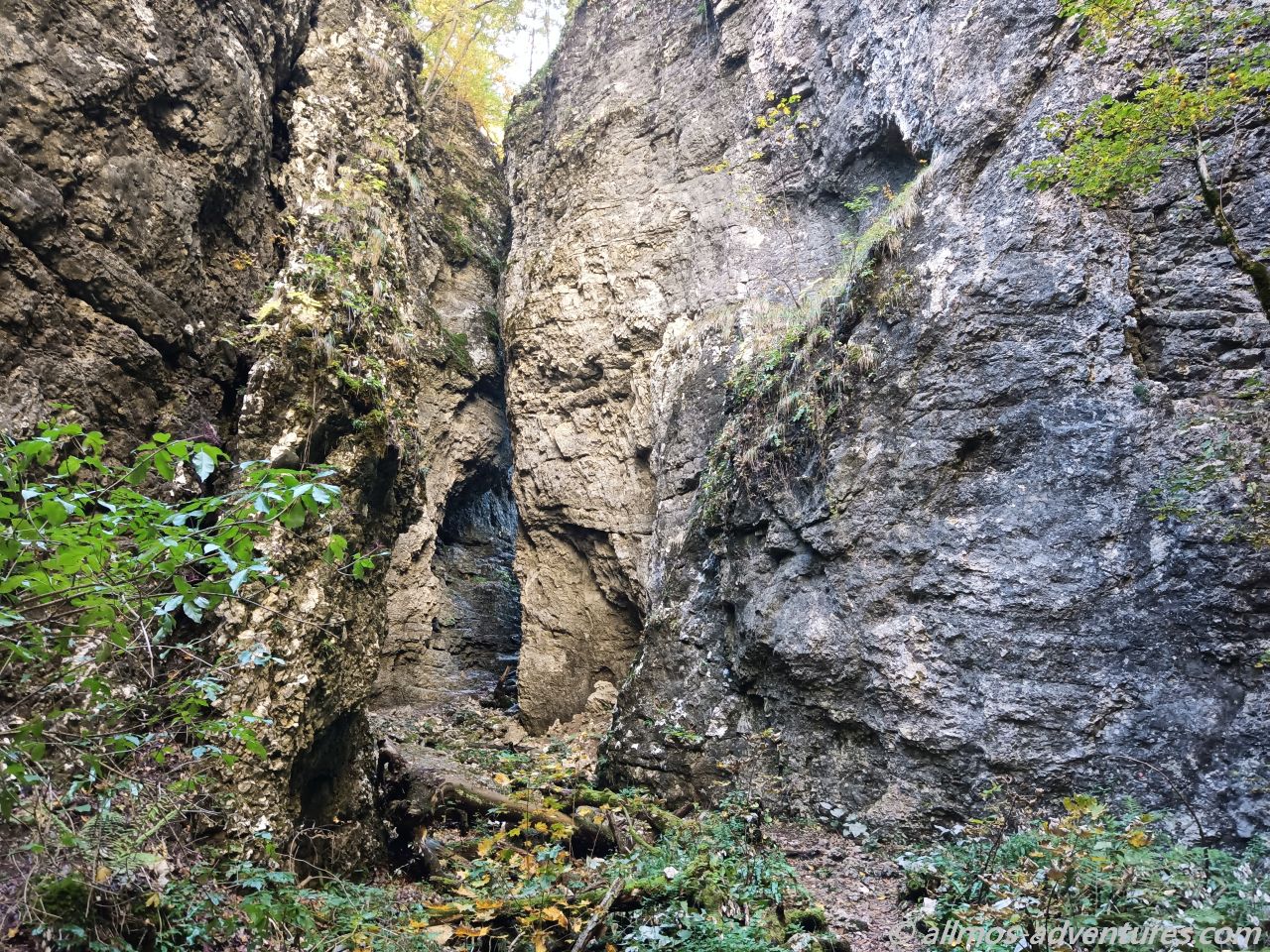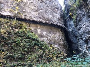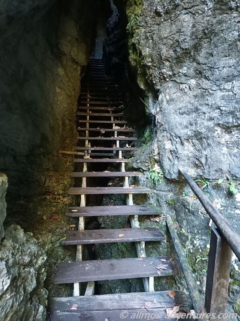 Von unten war der Weg zur Galerie nicht zu erkennen, doch als wir dem Trampelpfad hinauf folgten, standen wir plötzlich vor dem Holzsteg. Am Felsen entlang ging es anschließend Stufen hinauf, die in die Felsspalte gesetzt waren. Oben angekommen entsprangen wir dem Felsen und befanden uns wieder im Wald.