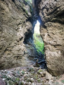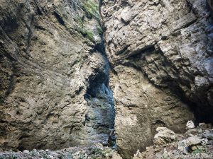 Natürlich entschieden wir uns für den kürzeren Weg und wanderten weiter bergauf. Die Landschaft wurde bald deutlich ansprechender. Rechts und links neben uns ragten meterhohe Felsen empor. Dann entdeckten wir eine Felsenbrücke, die sogar ausgeschildert war. Durch die kleine Schlucht ging es weiter bergauf. Und schon lag die Galerie vor uns.