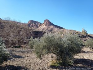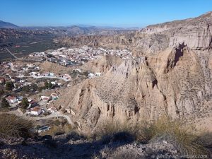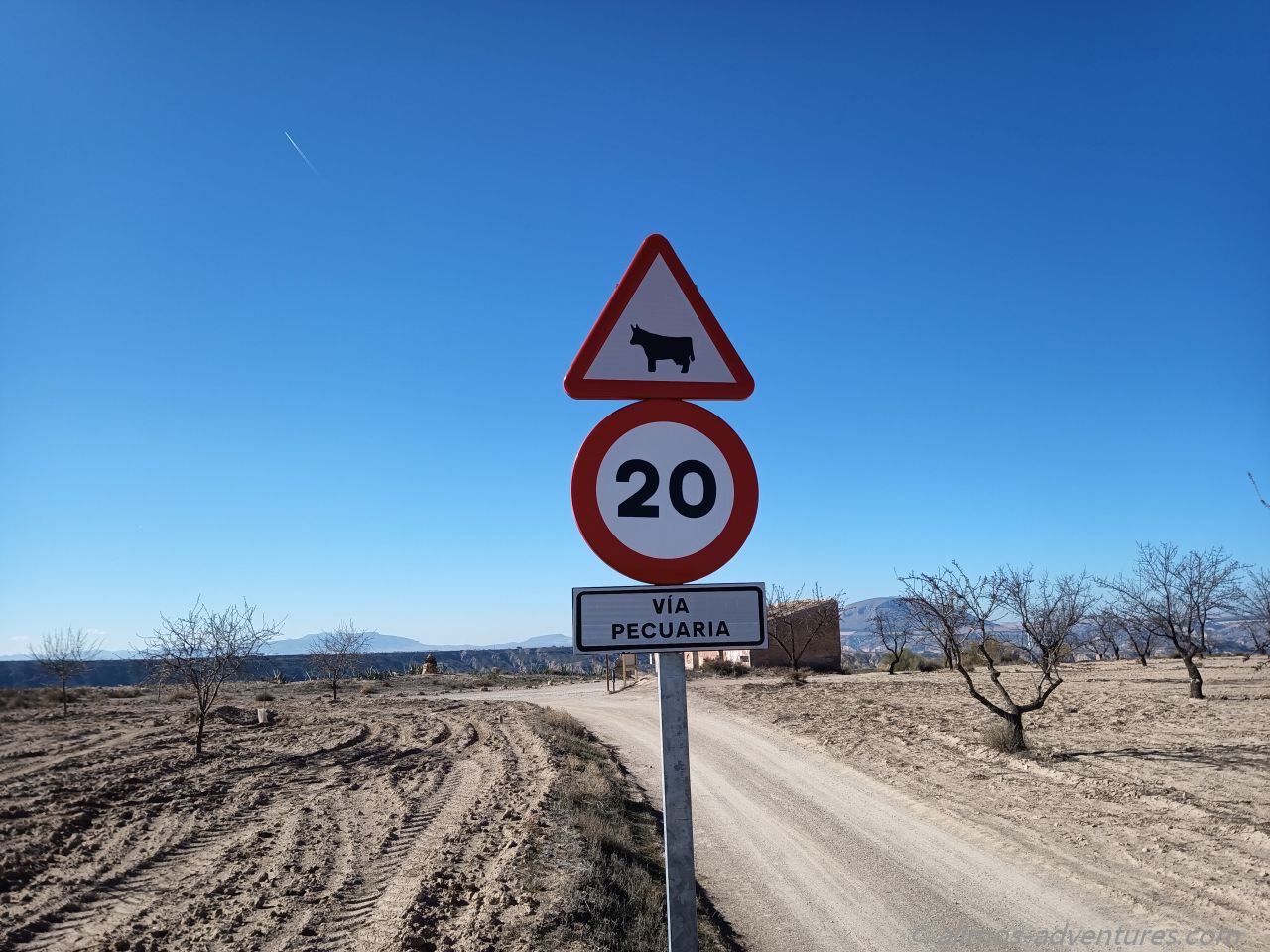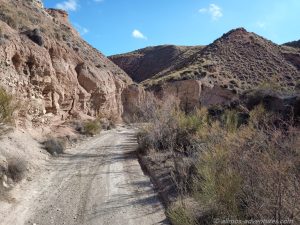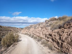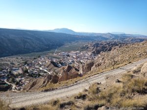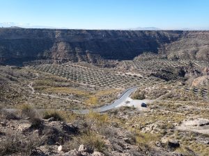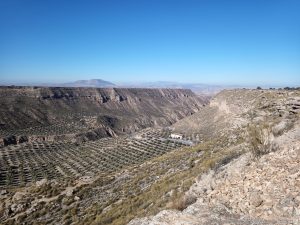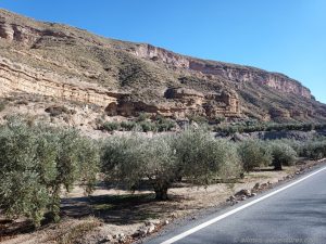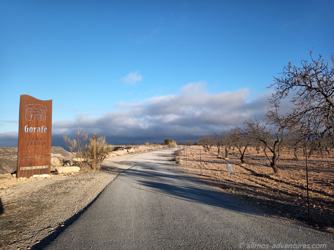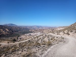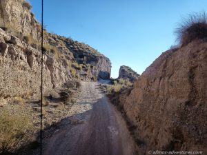Anstatt auf dem gleichen Weg zurückzufahren fuhren wir über eine zwei Kilometer lange steile Piste (zunächst Schotter, dann Beton) ins Dorf Gorafe hinab. Den Megalithweg dort sparten wir uns. Stattdessen radelten wir durch die Schlucht wieder in Richtung Allmo.
