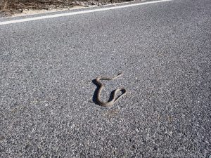 Die Landschaft begeisterte uns. Meterhohe Wände ragten rechts und links neben uns empor. Auf der Gegenspur entdeckte ich eine kleine Schlange (Hufeisennatter?), die nicht mehr so mobil war. Irgendwas hatte sie abbekommen, wodurch sie sich nicht mehr richtig fortbewegen konnte. Wir setzten sie mit einem langen Stock an den Wegesrand.