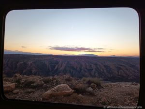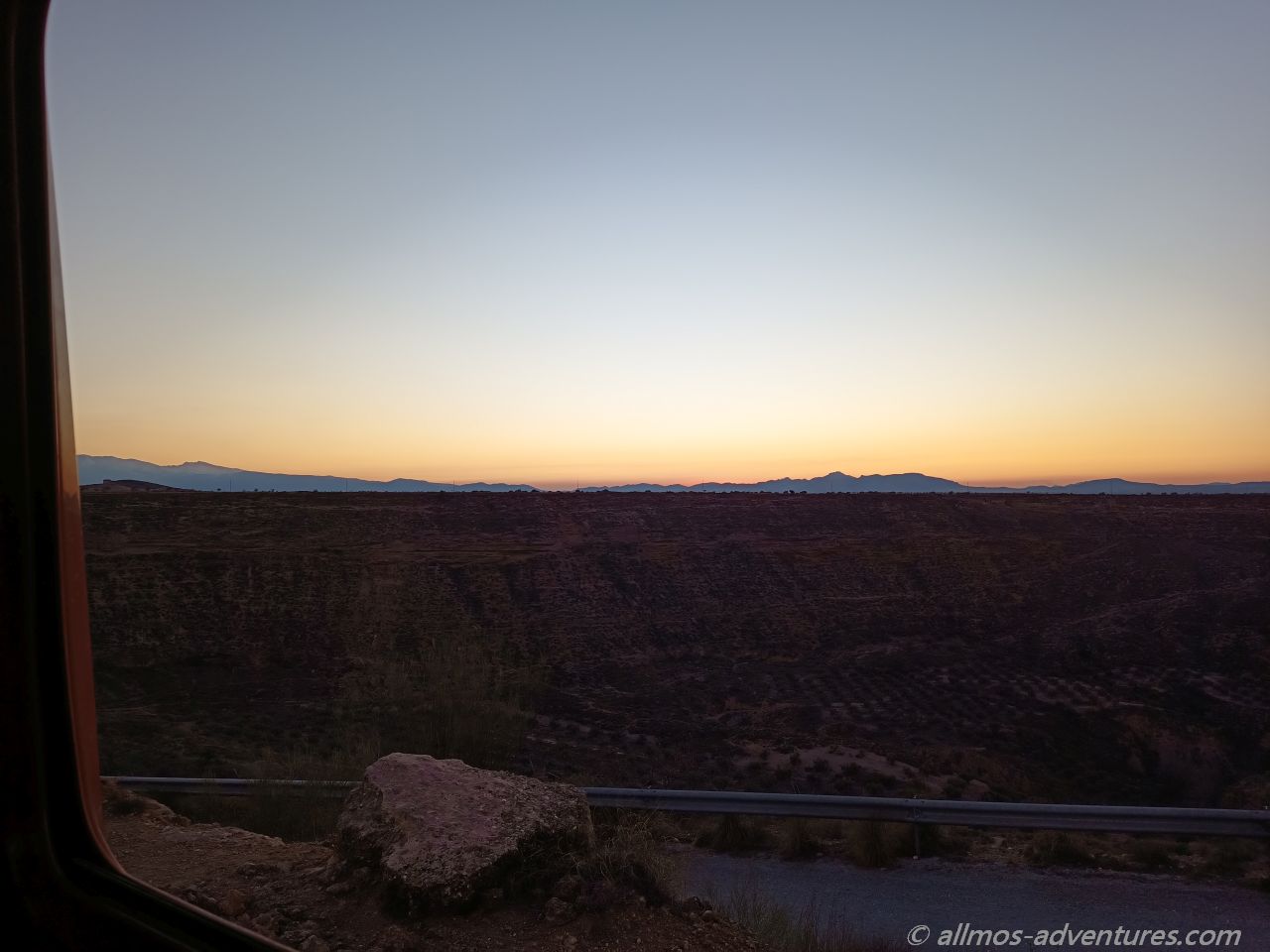 Nach ungefähr drei Stunden und 24 km im spanischen Grand Canyon hatten wir wieder eine ebene Fläche vor uns. Anstatt zu unserem alten Übernachtungsplatz zurück zu fahren stoppten wir in der Nähe der großen Funkantennen. Das Fahrzeug welches gestern und heute Morgen dort gestanden hatte war nicht mehr da und somit parkten wir dort ein. Unter uns lag das Dorf Gorafe.
