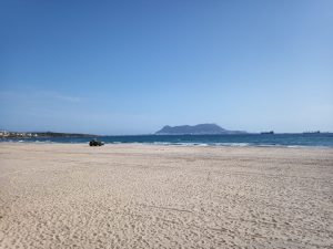 Entgegen manchen Bewertungen zu diesem Platz am Playa de Getares war es in der Nacht sehr ruhig. Keine Jugendlichen die Lärm machten, lediglich das Tuckern der Schiffsmotoren war zu hören und einmal auch ein Schiffshorn. Gestern Abend zogen bereits die ersten Wolken auf und am Morgen war es rundum verhangen. Der Rock von Gibraltar versank im Grau. Nach dem Frühstück fuhren wir weiter.
