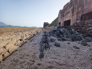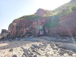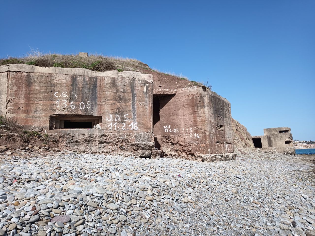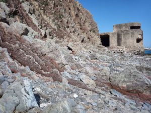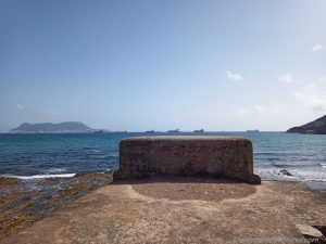 Mit Front zur Promenade und somit zum Meer parkten wir Allmo ein. Den Felsen von Gibraltar konnten wir in voller Breite von hier aus bewundern. Emma wollte nicht wirklich aus ihrer Höhle raus, so dass wir sie nach hinten verfrachteten, wo es kühler war und wir gingen alleine zum Strand. Eigentlich wollten wir uns nur auf die Decke legen. Doch als wir am rechten Ende der Bucht eine alte Befestigungsanlage erblickten entschieden wir dorthin zu laufen.