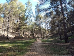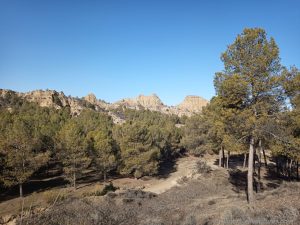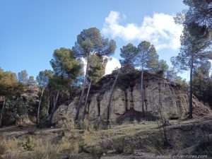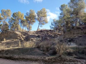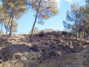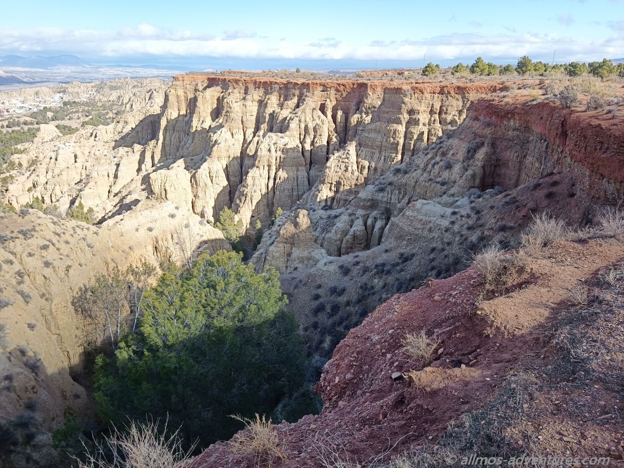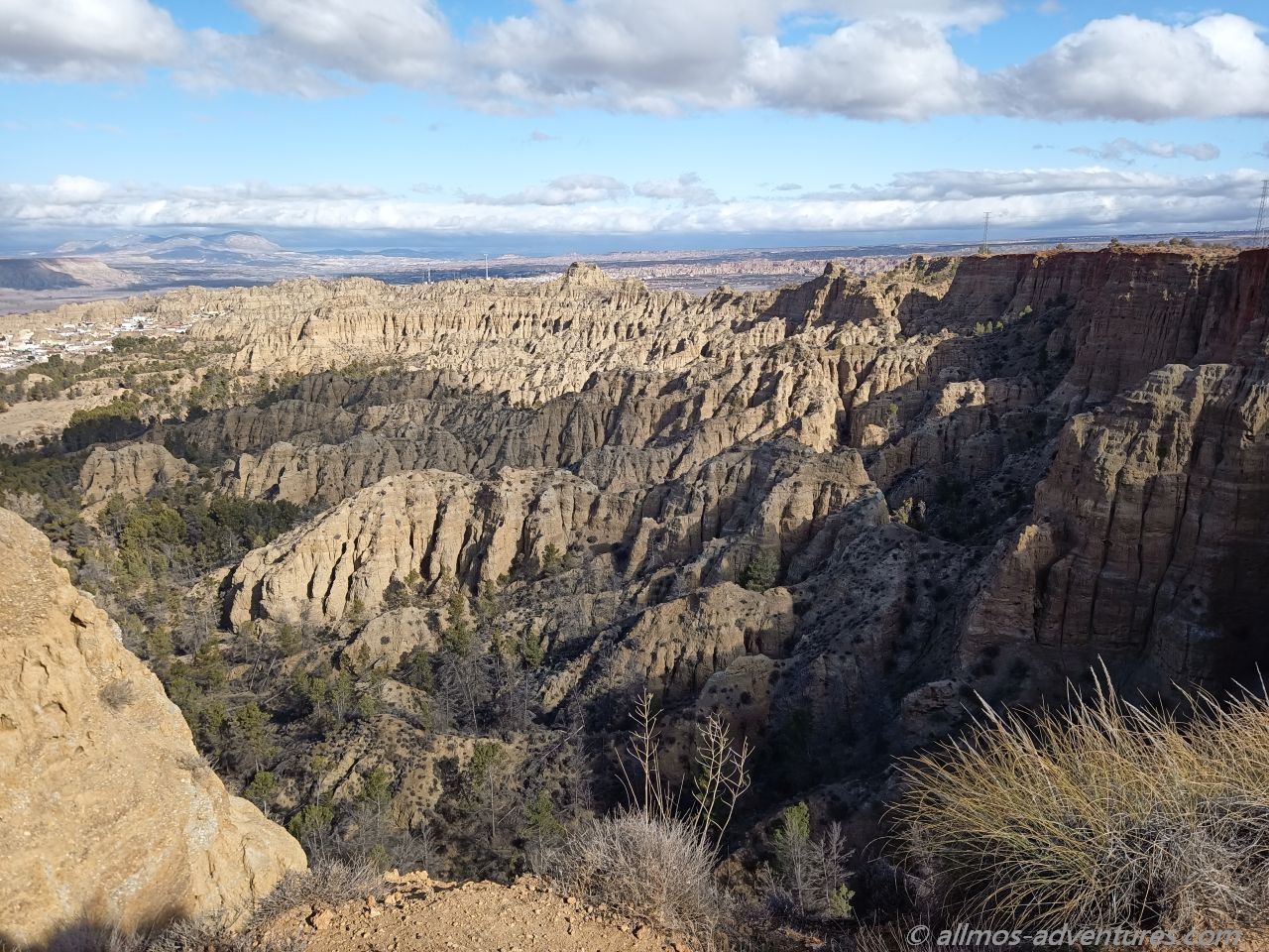 Mit den Rädern fuhren wir die 4 km bis zu einem unscheinbaren Waldstück, wo es in die Purullena Badlands ging. Zu Beginn stellten wir die Räder unter einem Baum ab und gingen los. Wie wir feststellten hätten wir auch mit Allmo ein ganzes Stück fahren können (wäre er denn fahrbereit), aber die Füße taten es auch. Später verließen wir die Fahrspur und bogen in den Wald bzw. auf den Bergrücken ab, um dann am anderen Ende wieder auf eine Fahrspur zu treffen. Und dann hatten wir auch schon den ersten Aussichtspunkt, den Mirador de Marchal erreicht. Wir blickten auf die Purullena Badlands und auf ein kleines Dorf. Wieder fühlten wir uns ein klein wenig wie in Amerika.