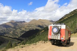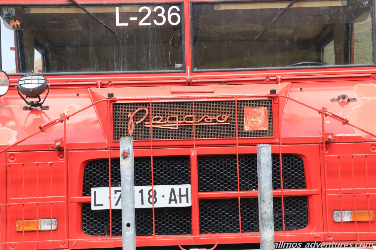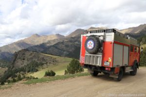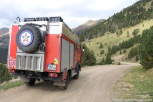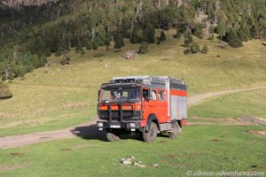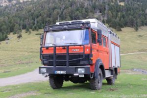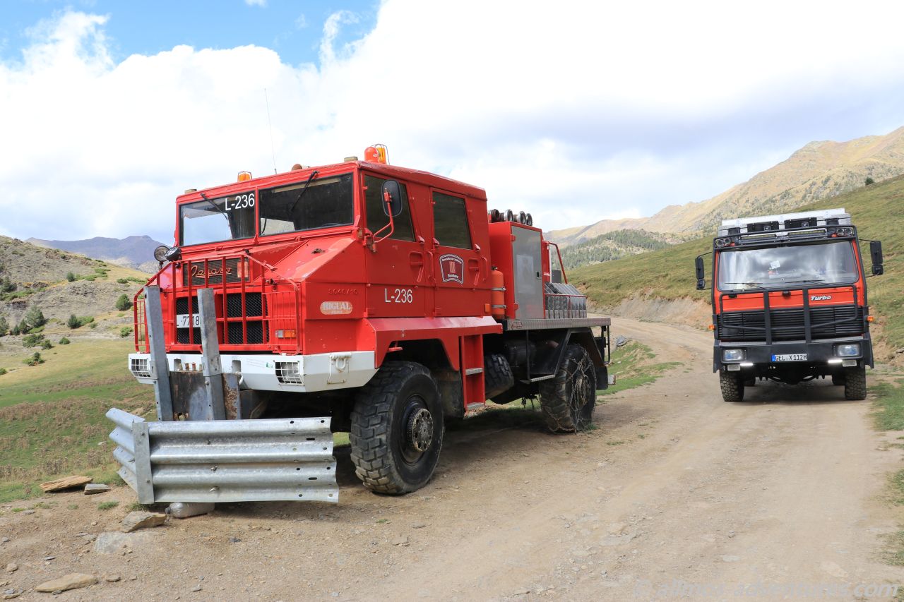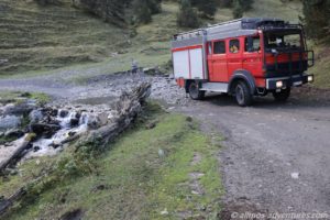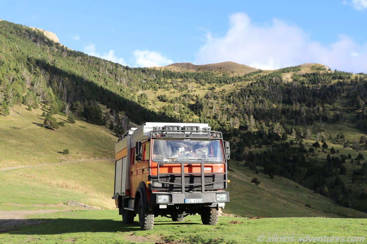 Unterwegs stand eine alte Feuerwehr (Pegaso), die nun augenscheinlich als Schneeschieber genutzt wird. Wir fuhren noch ein Stück weiter und stellten uns plötzlich die Frage, warum wir überhaupt weiterfahren. Je tiefer wir ins Tal fahren, desto schneller wird die Sonne später verschwinden. Also drehte Frank den Allmo in einer der Serpentinen und wir fuhren wieder ein Stück den Berg hinauf. Oberhalb von der Feuerwehr, auf einer graden Fläche schlugen wir unser Nachtlager auf.