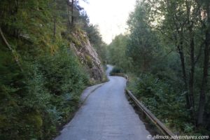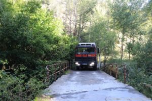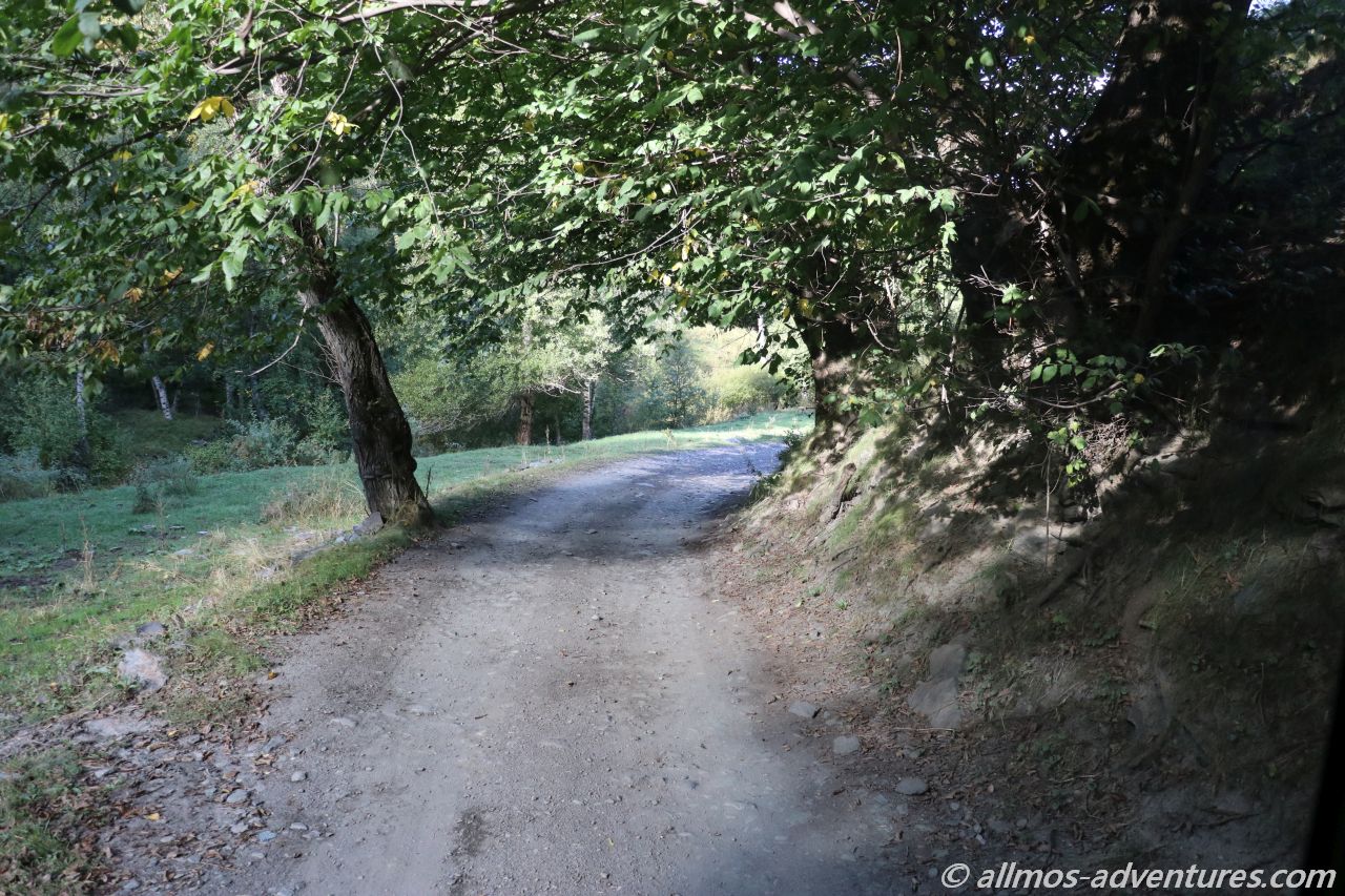 Ab Tor hatte Allmo immer wieder mit tiefhängenden Ästen zu kämpfen, die zum Glück alle weich waren und wohl keine Schäden auf unseren Solarmodulen hinterlassen haben. Eine kleine Herausforderung war eine sehr schmale Brücke, in einer Kurve. Das Brückengeländer aus Metall war auch schon leicht lädiert. Ich stieg aus und ging mit Walkie Talkie bewaffnet über die Brücke, um Frank eventuell lotsen zu können. Natürlich war das vollkommen unbegründet. Frank und Allmo sind halt ein super eingespieltes Team.