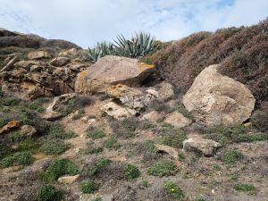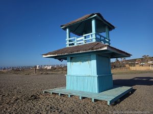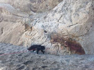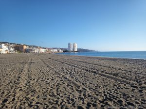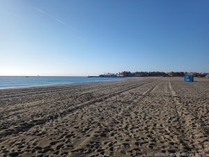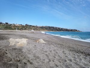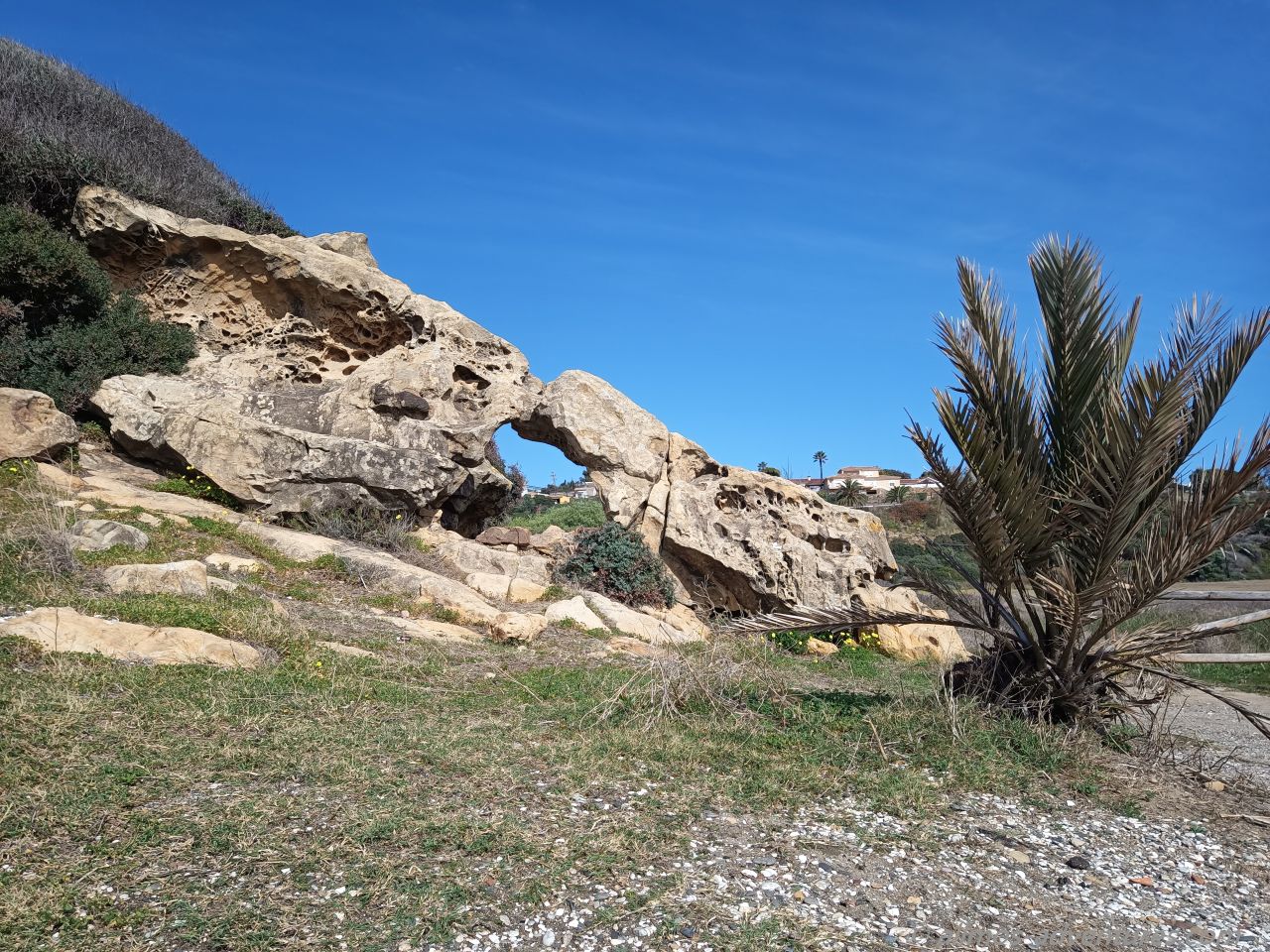 Auf dem Weg nach Sotogrande stoppten wir an der Cala Sardina. Auf dem oberen Parkplatz standen ein paar Camper, die augenscheinlich schon eine Weile länger dort standen und sich häuslich eingerichtet hatten. Für den unteren Parkplatz gab es eine Höhenbeschränkung auf 2 m Höhe, jedoch keinen Balken. Wir parkten dennoch oben und gingen mit Emma hinunter zum Strand.