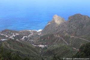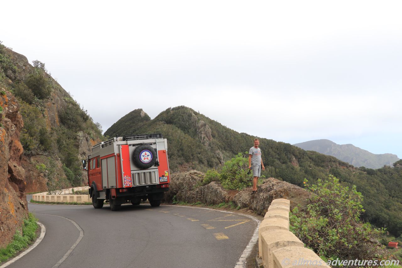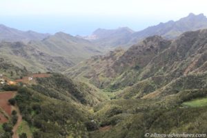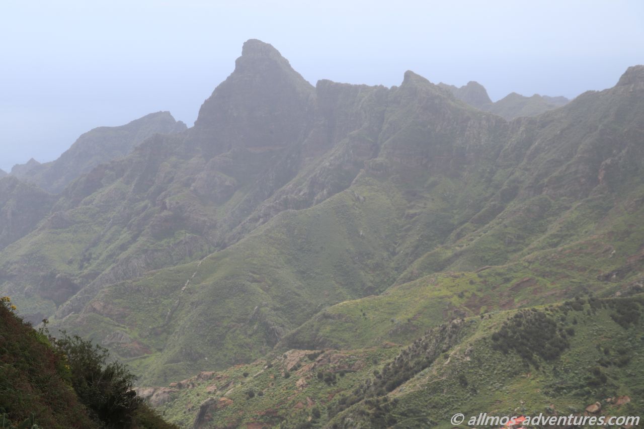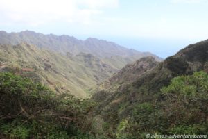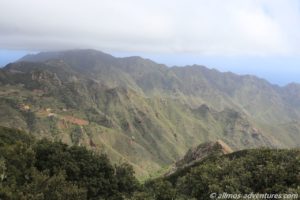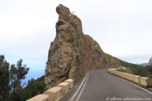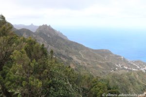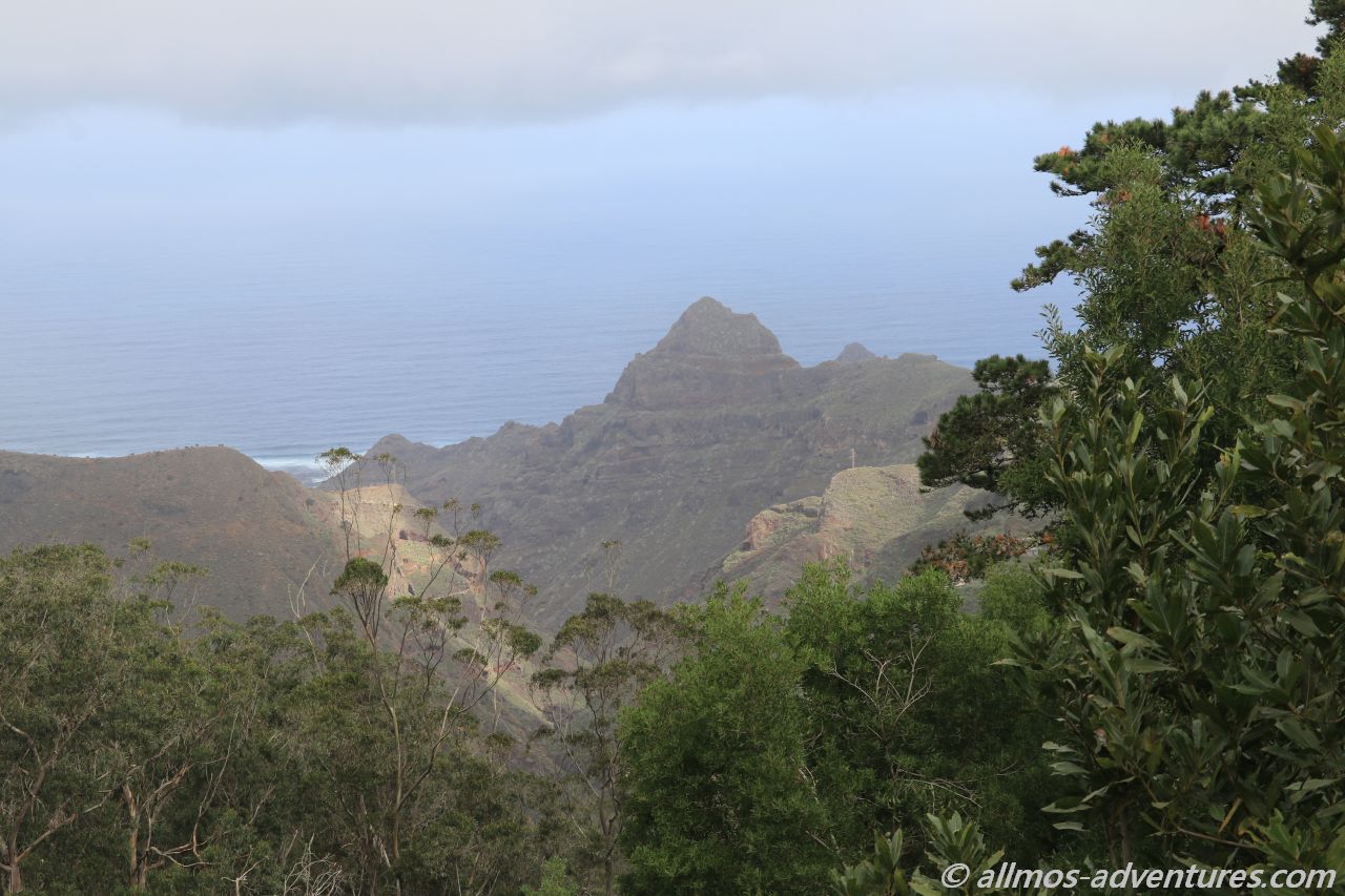 Diese 20 Kilometer hatten es noch ganz schön in sich. Wie gut, dass wir nicht hungrig und ungeduldig waren. Allmo musste sich durch so einige Kurven schlängeln. Anfangs ging es noch durch viel märchenhaften Wald. So viel Wald haben wir schon lange nicht mehr gesehen und wenn man nicht immer mit Gegenverkehr rechnen müsste, dann wäre so eine Fahrt durch den Wald richtig schön. Dann wurde immer mal wieder ein Blick auf die Küste und die Berge des Anaga-Gebirges frei. Wobei ich natürlich das besser sehen konnte, was sich auf meiner Seite der Straße befand.