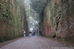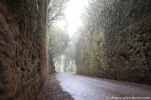Meterhohe mit Moos und Grünspan überzogene Wände ragten beiderseits des Camino viejo empor. Oben drauf wuchsen vermutlich Lorbeerbäume. Der Weg hatte beinah etwas von einem Tunnel. Kein Sonnenstrahl erreichte den Boden (was auch daran liegen könnte, dass sich Wolken vor der Sonne befanden). Eigentlich ein mystischer Ort, wenn nicht gerade so viele Menschen dort gewesen wären.