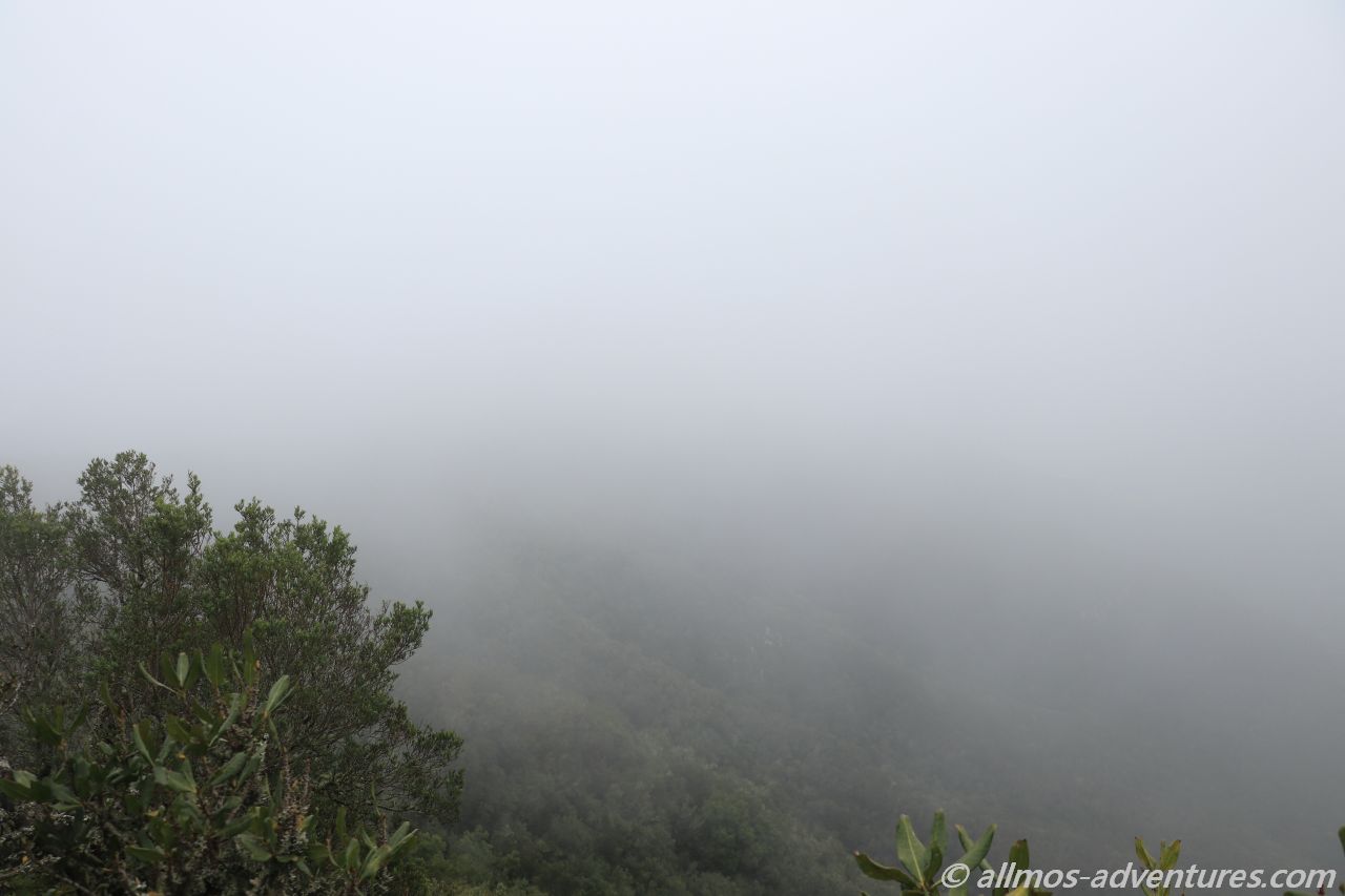 Wenn ich schonmal dort war, dann wollte ich mir den Mirador Pico del Ingles nicht entgehen lassen. Irgendwann endete plötzlich die Reihe der am Rand geparkten Fahrzeuge und ich dachte schon, ich hätte mich auf dem Weg zum Mirador verlaufen. Mein Handy hatte ich bei der Flucht aus Allmo nicht mitgenommen. Aber ich war mir ganz sicher, dass es nur einen Weg gab, der dorthin führte. War auch so. Kurz vor Erreichen des Mirador standen am Rand zwei Fahrzeuge geparkt und dann lag der Weg zum Mirador auch schon vor mir. Doch was war nur mit der Aussicht? Die war nicht vorhanden. Der Pico del Ingles blieb unsichtbar. Das hatte sich ja gelohnt.