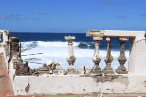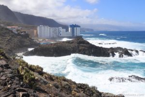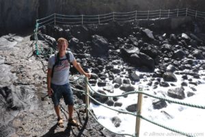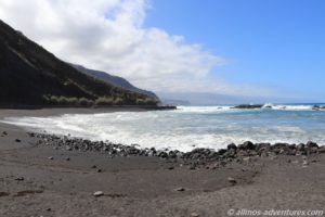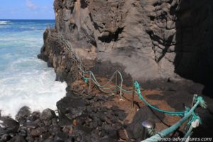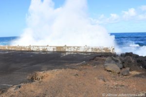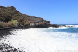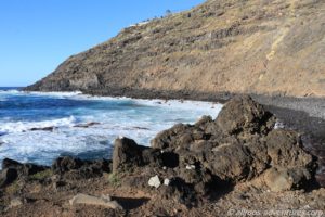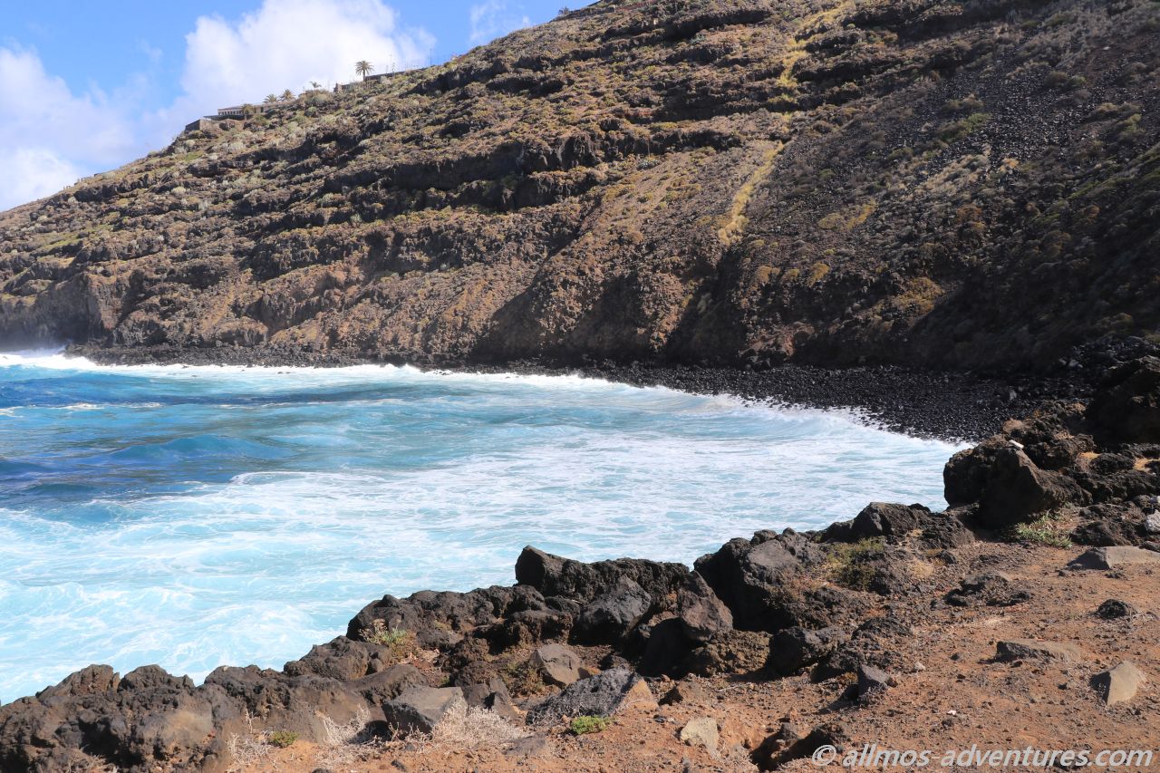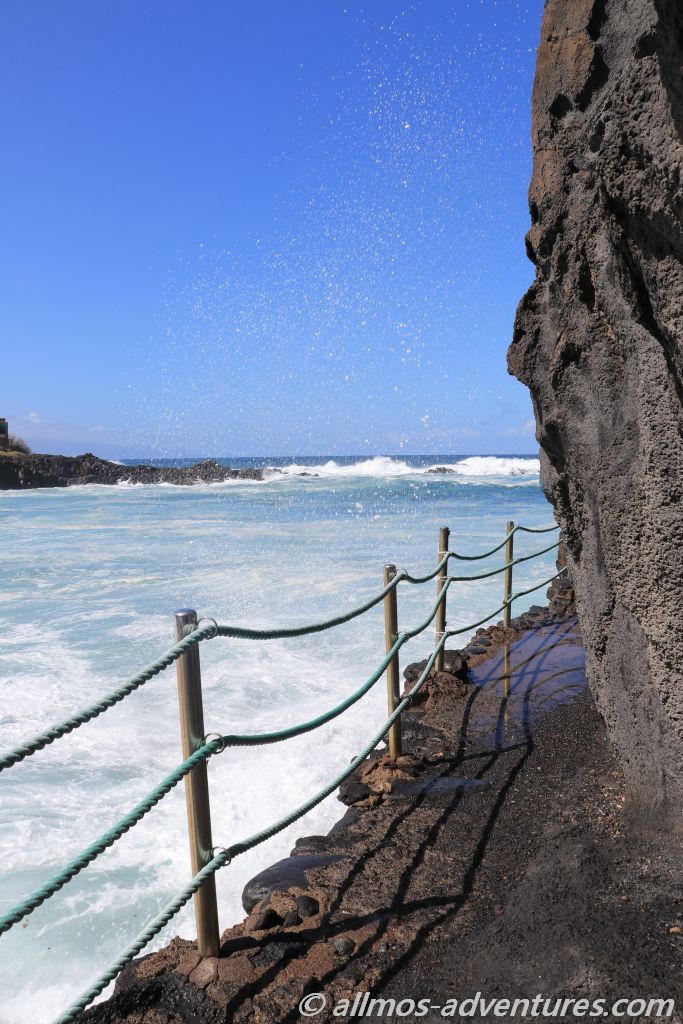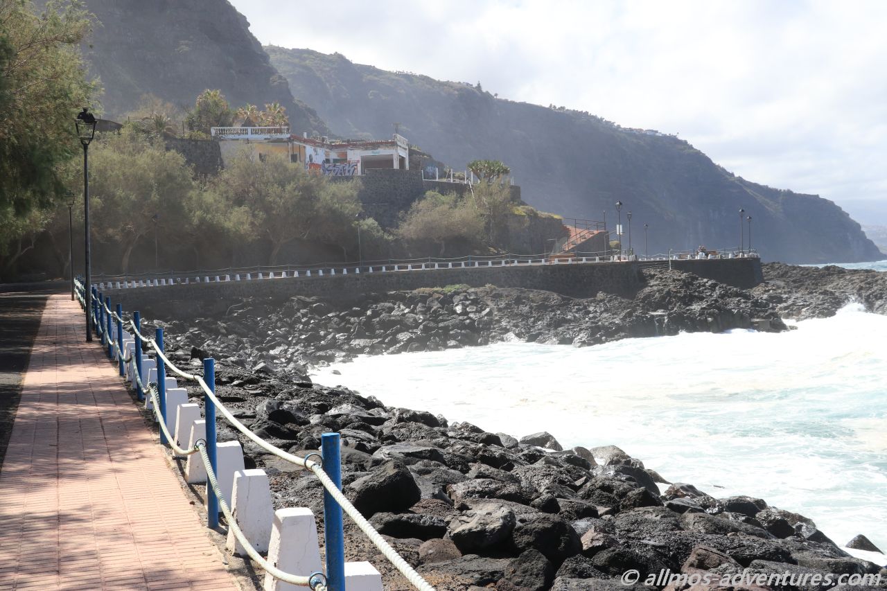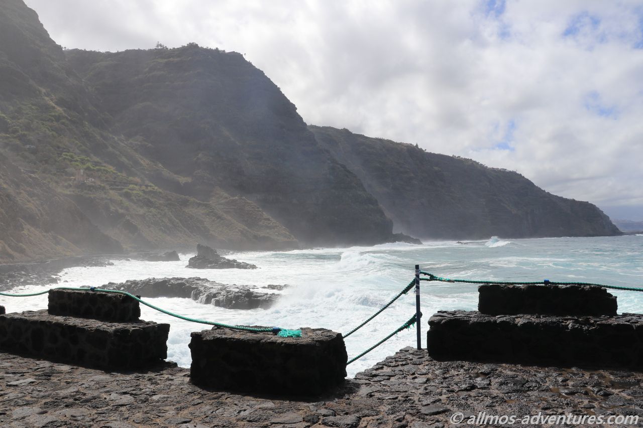 Wir durchliefen den kleinen Ort El Pris, kamen an dem Naturpool und ein paar Restaurants vorbei und hielten uns weiter an der Küste entlang. Dort mussten wir auf einem Stück aufpassen, dass uns keine Welle erwischt, sonst wären wir von der Gischt ganz schön nass geworden. Das Wasser lief quasi die paar in den Felsen gehauenen Treppenstufen hinunter.