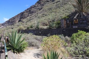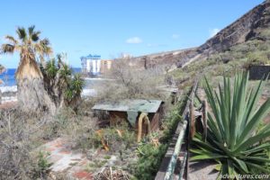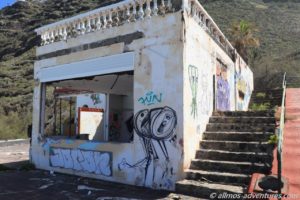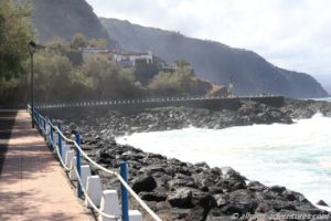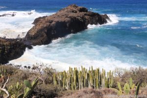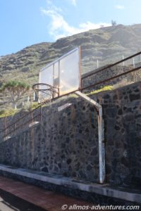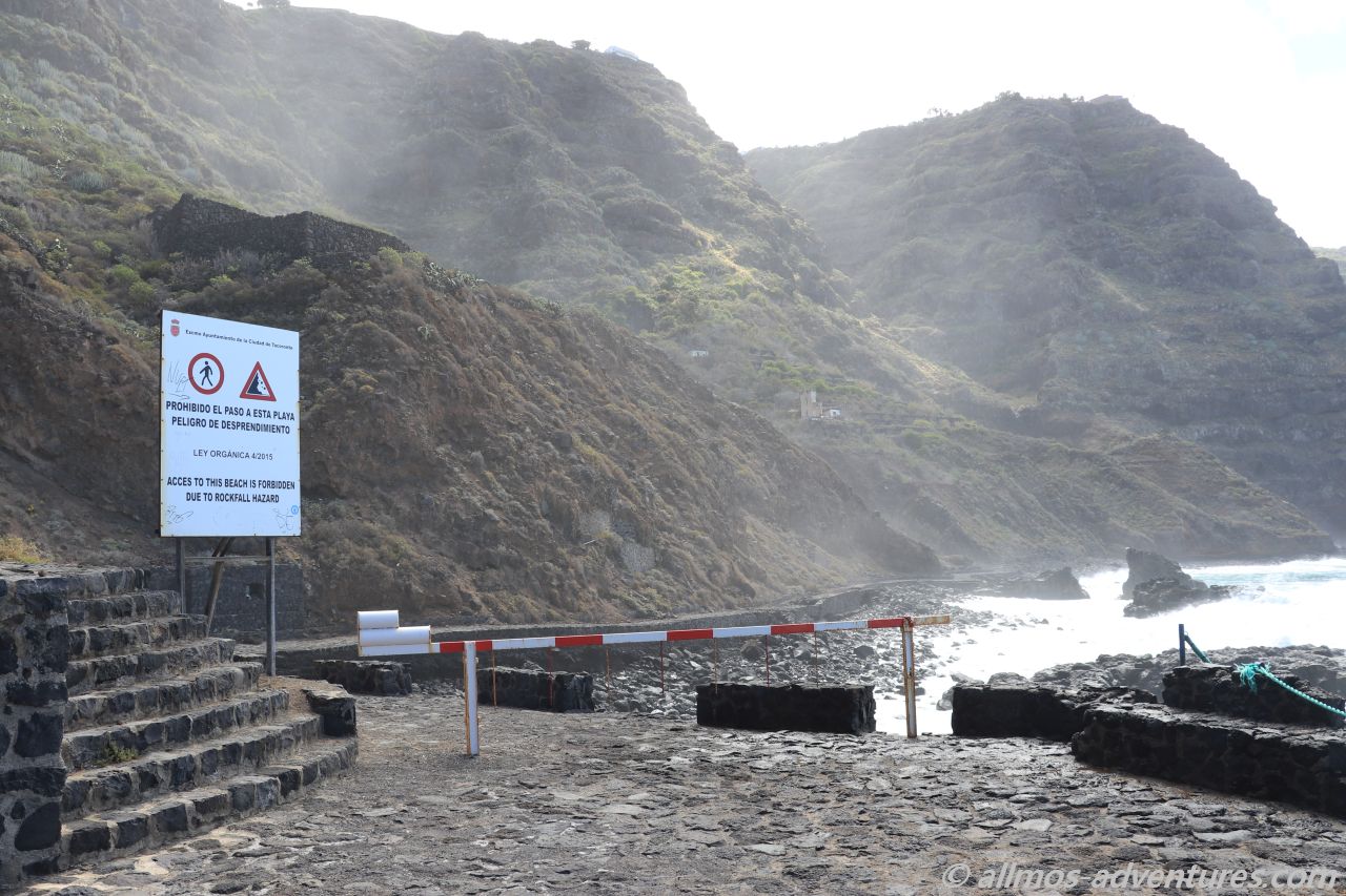 Wir setzten uns anschließend noch etwas hin und blickten auf die Küste mit ihren grün bewachsenen Klippen. Teneriffa hat auch seine schönen Seiten. Der Weg, der eigentlich noch „um die Ecke“ zu einem Kieselsteinstrand führt, war mit einer dicken Schranke versperrt. Es besteht die Gefahr von Steinschlag.