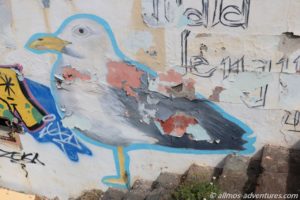 Über die Rampe, die die beiden Parkplätze voneinander trennt (auf dem Parkplatz mit dem Katzen-Container wäre es vermutlich möglich gewesen mit Allmo zu parken) ging es für uns weiter. Als wir von dieser Zufahrtsstraßen-Rampe wieder in Richtung Küstenweg abbogen, fiel Frank auf, dass sich unter der Zufahrtsstraßen-Rampe Wohnungen befanden. Da kam also irgendein schlauer Mensch auf die Idee, darunter ein Gebäude zu errichten. Eigentlich ist der Platz somit geschickt genutzt. Und so richtig viel Verkehr gibt’s ja auch nicht. Halt nur die Strandbesucher und die Leute die zu den schönen weiß blauen Appartements wollen.