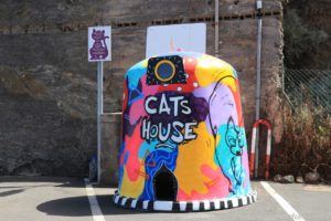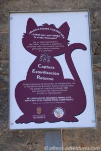Anschließend ging’s für uns auf dem gleichen Weg wieder zurück. In Mesa del Mar nahmen wir den direkten Weg, anstatt den minimalen Umweg über die Küste. Dabei viel uns auf der zweiten Parkebene ein ehemaliger Müllcontainer auf (vermutlich Glas), der zu einem Haus für Katzen umgestaltet worden war. Unten befanden sich zwei Eingänge und dort wo das Altglas eingeworfen wurde, waren Scheiben angebracht, so dass wir in das innere der Katzenwohnung blicken konnten. Auf mehreren Ebenen gab es Liegeflächen. Ein großer Napf mit Trockenfutter stand bereit. Nur Katzen waren nirgends zu sehen. Eine sehr schöne Idee, den Straßenkatzen so ein zu Hause zu geben.