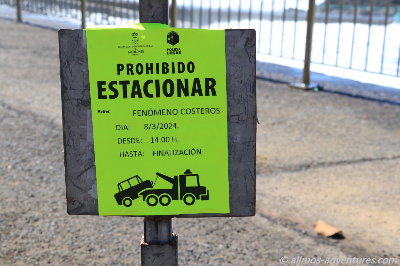 An dem Parkstreifen unmittelbar am Meer standen Halteverbotsschilder, mit der Ergänzung, dass dieses Verbot erst heute am 14 Uhr gelten würde und so lange gilt, wie die Küstenphänomene andauern. Wie lustig, denn dann hätte ja schon wieder Ebbe eingesetzt. Also waren die Schilder von der Uhrzeit her nach unserer Ansicht falsch beschriftet. Aber uns sollte das egal sein.