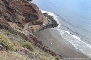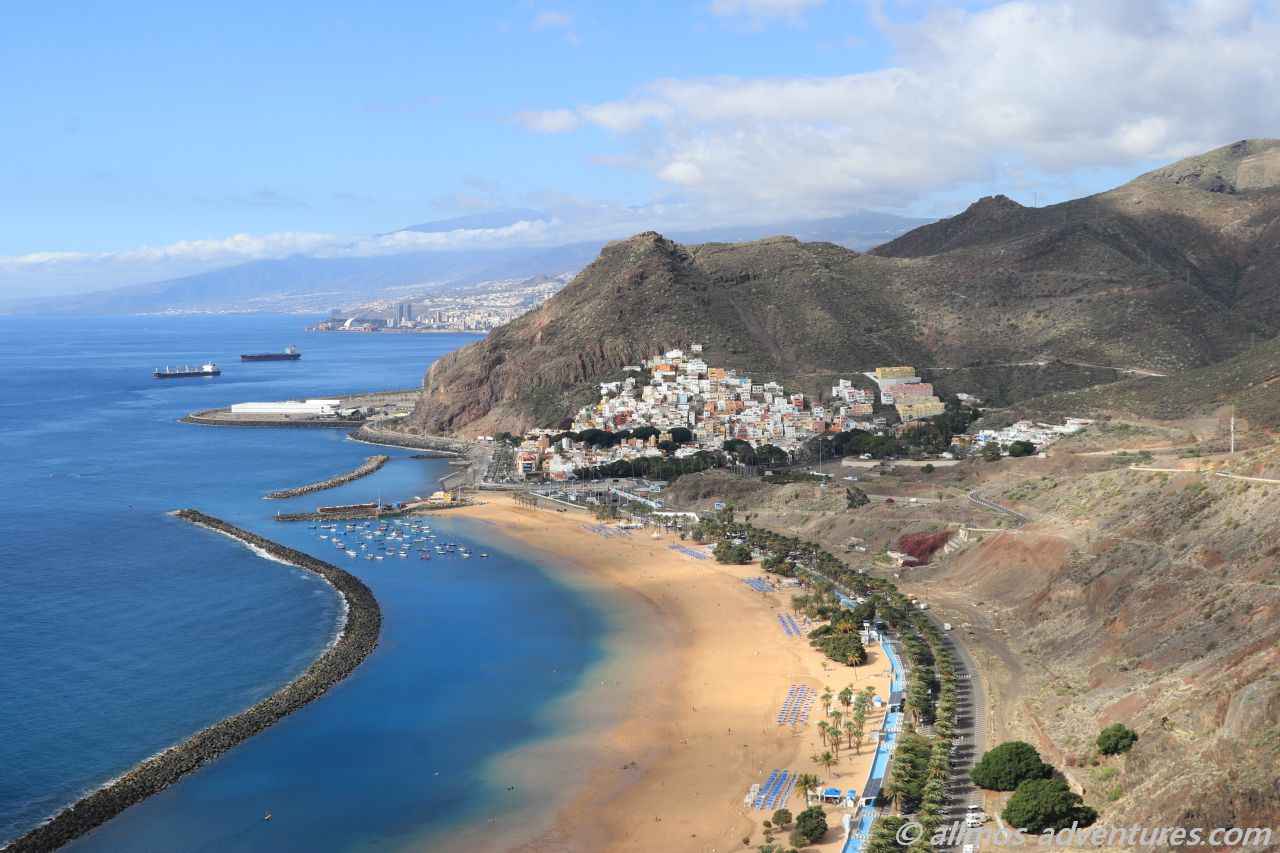 Wir stoppten an einem Mirador, an dem es eigentlich keine Parkmöglichkeiten gab, nur ein ganz schmaler Schotterstreifen stand dafür zur Verfügung. Auf der einen Seite blickten wir auf die Playa de las Teresitas und auf die Inselhauptstadt Santa Cruz de Teneriffa, welche sich ein wenig dahinter befindet. Auf der anderen Seite sahen wir unser Übernachtungsziel, die Playa de las Gaviotas, eine Bucht mit schwarzem Sandstrand. Der Parkplatz war schon sehr gut gefüllt.