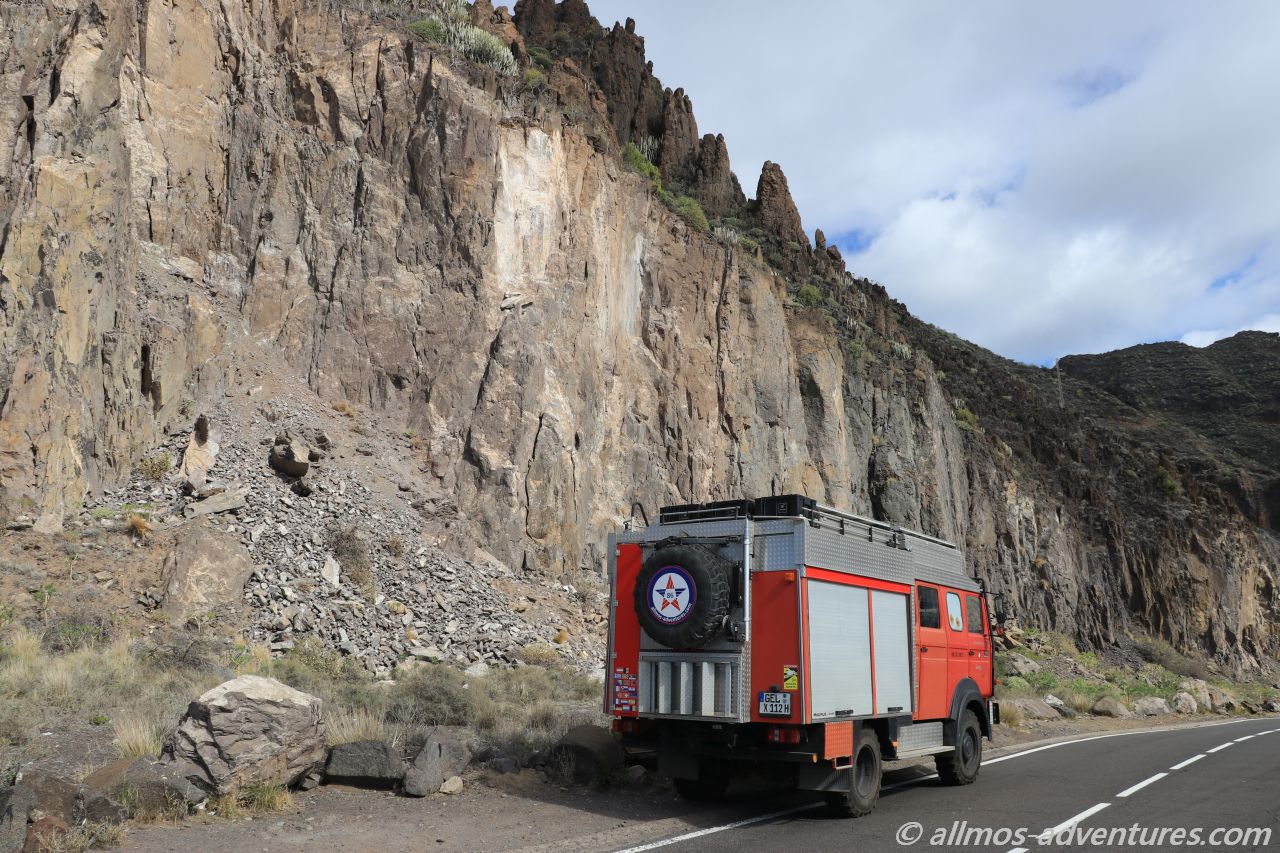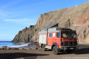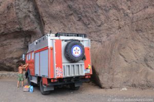 Wir setzten unsere Fahrt zur Playa de las Gaviotas fort. Irgendwo werden wir schon noch einen Parkplatz für Allmo ergattern. Allmos Motorbremse durfte auf dem letzten Stück hinter zum Meer wieder richtig Arbeiten. Die Plätze zum Meer hin waren alle belegt, bzw. wollten wir uns nicht hinten in eine Pfütze und direkt neben einem Mercedes Vario aus Deutschland stellen. Also parkten wir direkt an der Felswand, die allerdings mit dicken Stahlnetzen überzogen war, so dass kein Stein den Weg nach unten finden dürfte.