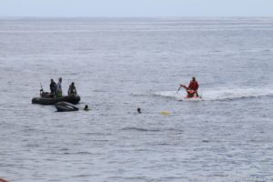 Unser Fernglas und das Telezoom der Kamera brachten die Lösung: Es war ein gekenterter Jetski, neben dem sich drei Menschen im Wasser befanden. Während einer der Männer der Strandwache sich mit Rettungsboje auf dem Weg machte, kam von links ein Schlauchboot mit drei Fischern zur Hilfe und von rechts (vermutlich von der Playa de las Teresitas) der herbeigerufene Jetski vom Cruz Roja. Per Megafon signalisierte der Rettungsschwimmer, der sich an Land befand, dass die gekenterten Leute warten sollen, bis die Hilfe da ist. Was ja gar nicht lange dauerte.