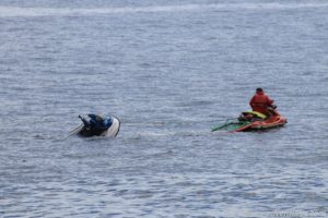 Nachdem das Fischerboot ein Seil zur Verfügung stellte, wurde der gekenterte Jetski, der mittlerweile zwar wieder richtig rum stand, aber mit dem Heck immer noch im Wasser versunken war, an den Cruz Roja Jetski festgebunden. Die zwei gekenterten Herren nahmen auf dem Jetski vom Cruz Roja Platz und die Dame wurde von dem Rettungsschwimmer an den Strand geschleppt.