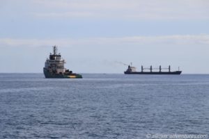 In Küstennähe ankerten mehrere Schiffe, bei denen es sich vermutlich um Fischerboote und Öltanker handelte. Der Hafen von Santa Cruz liegt ja quasi um die Ecke und irgendwo muss man ja warten. So Meeresparkplätze sind definitiv einfacher zu bekommen und zu finden als LKW-Parkplätze.