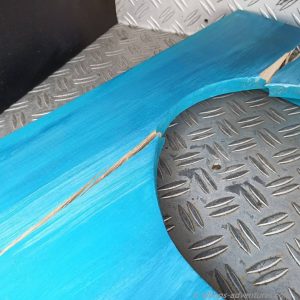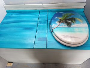Unglücklicherweise schaffte Frank es kurz nach dem Einbau (als der TTT-Einsatz noch nicht angeklebt war), einen Teil der Holzumrandung wo der TTT-Einsatz angeklebt wird abzubrechen. Dabei hatte ich alles schon schön mit Kreidefarbe** gestrichen. Wir verstärkten den Unterbau um den Lochausschnitt, klebten die Bruchstelle mit Holzleim** zusammen und ich tupfte etwas mit der Kreidefarbe nach. So wird es hoffentlich unser Gewicht halten.
