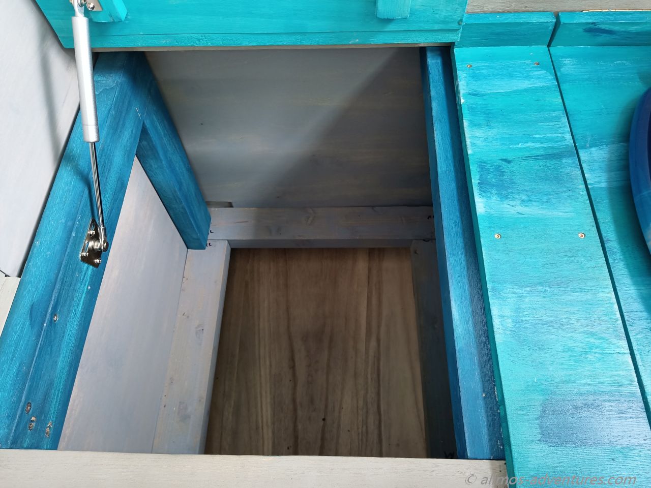 Unter der neben der TTT befindlichen Sitzbank werden wir unsere Schmutzwäsche sammeln. Außerdem wird dort noch das Katzenfutter, weiteres Kleintierstreu und Toilettenpapier aufbewahrt.