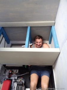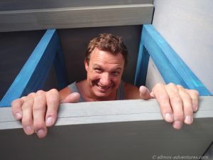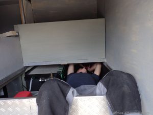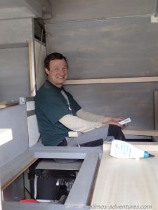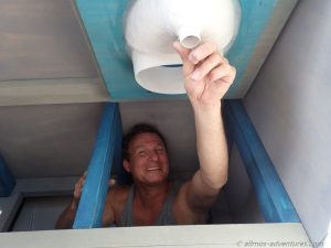Während des Innenausbaus vom Koffer entwickelte Frank sich immer mehr zum Holzwurm. Innenwände bzw. Wandverkleidung, abnehmbare Bodenabdeckungen und unser Waschtisch wurden aus Holz gebaut. Von den Holzarbeiten an der Innentreppe und Trockentrenntoilette hatte ich schon separat berichtet.