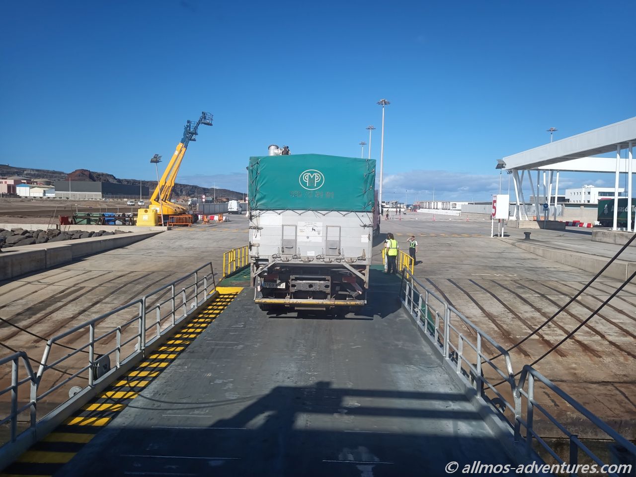 Am Eingang des Terminals von Naviera Armas/Trasmediterranea wurden von einem Mitarbeiter auf die Reihe 9 verwiesen. Insgesamt gab es 10 Reihen. In den ersten Reihen standen Pkws. Je nach Größe und Gewicht wurden die Fahrzeuge auf die 10 Reihen aufgeteilt.