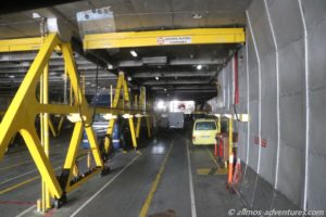 Gegen 11 Uhr war es dann tatsächlich so weit, die ersten Pkws setzten sich in Bewegung und verschwanden nach und nach in dem Bauch des Katamarans. Irgendwann waren auch wir an der Reihe. Wir folgten den Pkws/Vans und wurden dann in den Mittelgang gelotst. Ein 40 Tonner LKW stand dort bereits ganz links geparkt. Wir wurden auf die mittlere Spur gelotst. Rechts neben uns parkten die Womos.