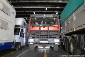 Zwischen LKWs und Womos werden Allmo und Emma die Überfahrt antreten. Ach ja, unser elektronisches Ticket wollte niemand sehen. Vermutlich wurden wir anhand unseres Kfz-Kennzeichens abgehakt.
